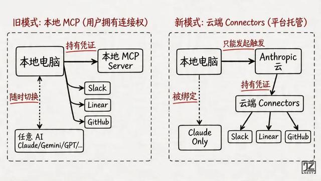 本地 MCP Server:凭证、配置、连接逻辑全部放在本地。这意味着使用者拥有绝对的所有权:理论上这些连接可以被任何支持 MCP 的 AI 使用,不止 Claude