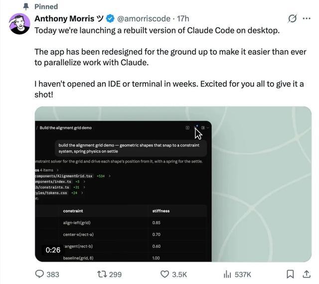 Claude Code 桌面端负责人 Anthony Morris 最近发了一条推文,是这次更新里最值得玩味的一句话: